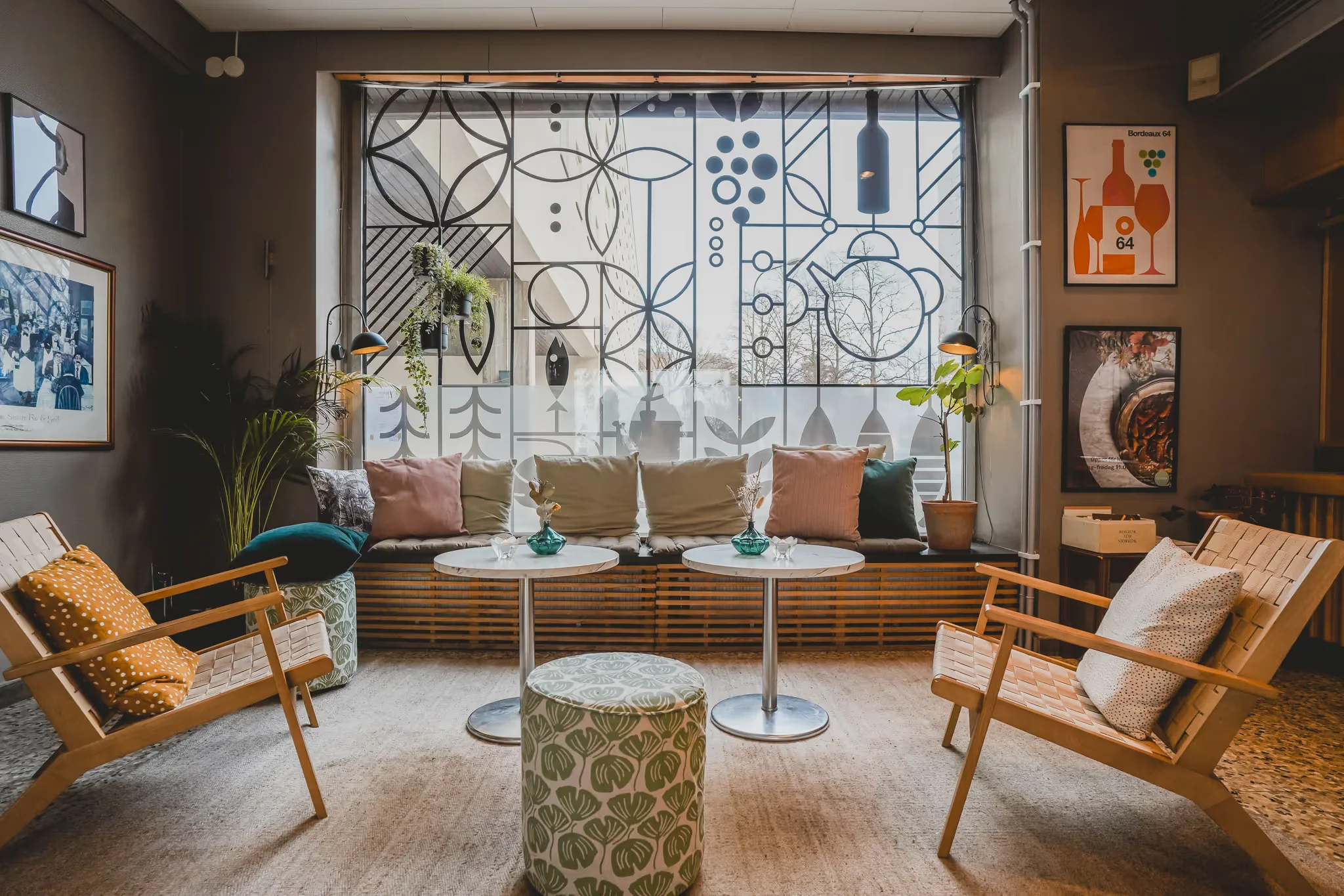 Avslappnad och stilren plats för fika, lunch och enklare mingel i Vrak Museums unika miljö med närhet till vattnet.